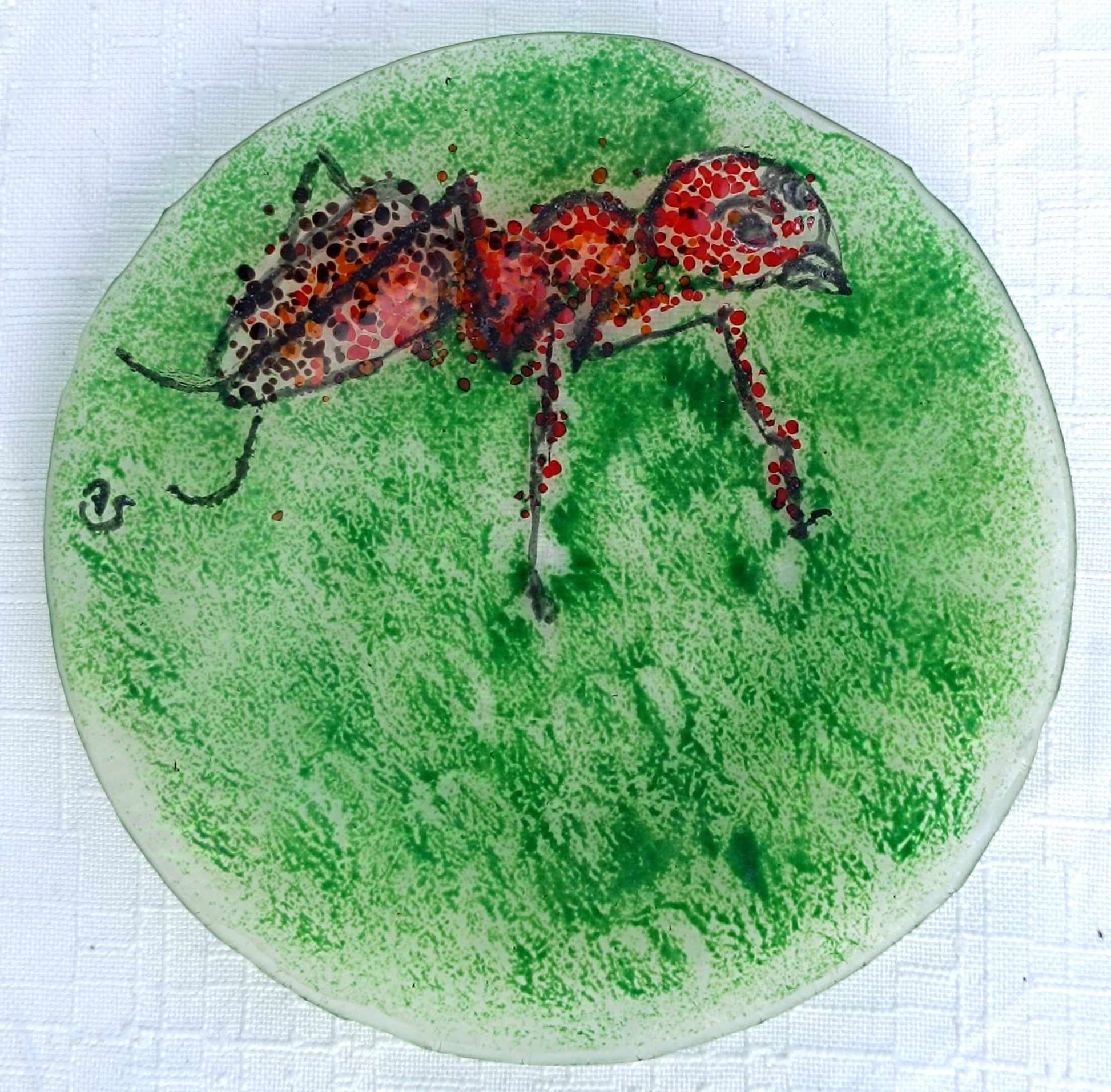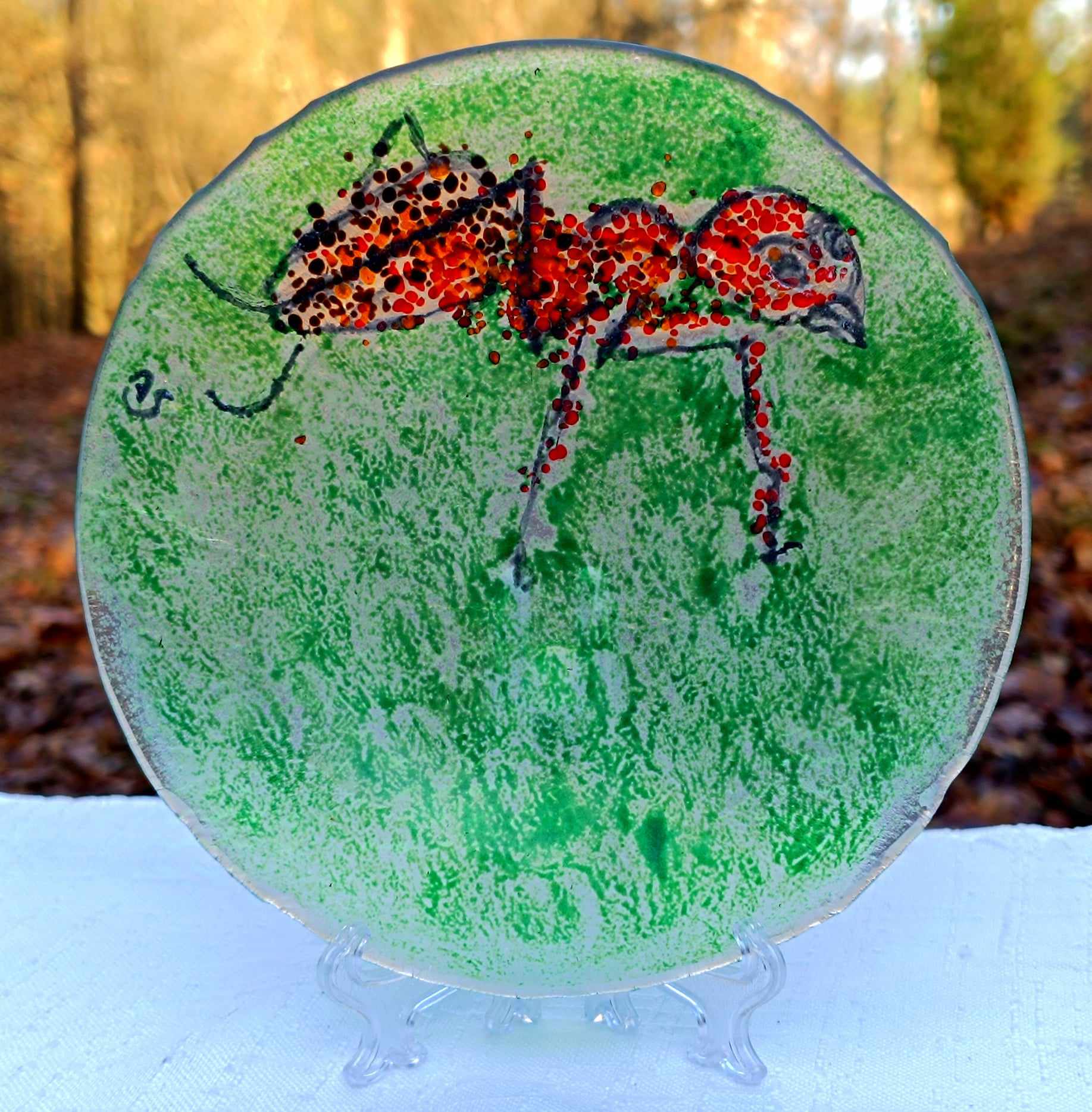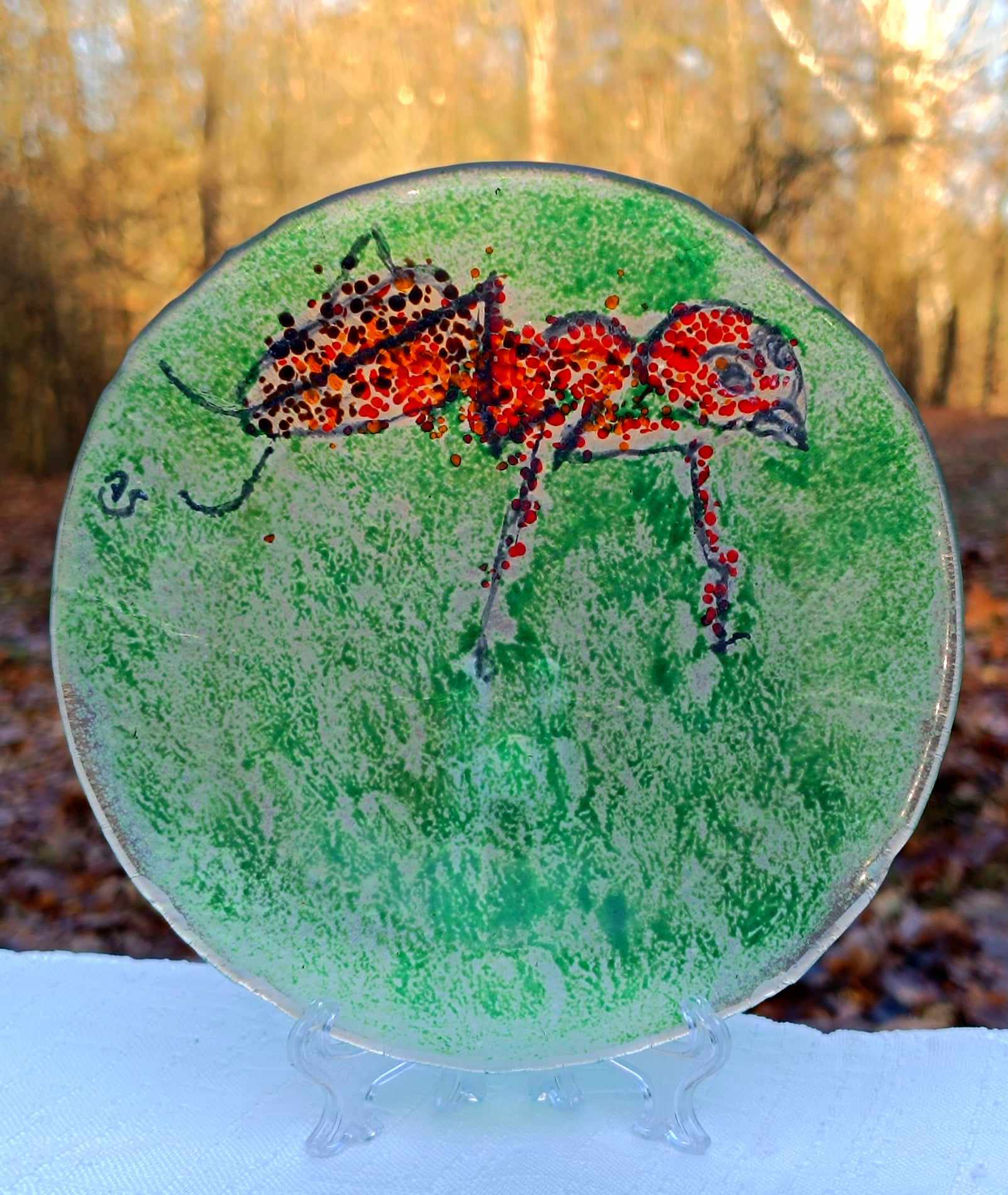Wykonany techniką fusingu polegającą na stapianiu warstw szkła w piecu, w wysokiej temperaturze - 850 C. Przezroczystą taflę szkła posypuję kolorowymi, sproszkowanymi szkłami, które po stopieniu tworzą barwne, unikatowe wzory — proces ten wymaga precyzji, skupienia oraz dogłębnej znajomości rzemiosła.
